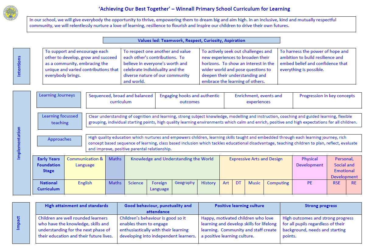 At Winnall Primary School our curriculum reflects what our children and community need. We are ambitious and passionate for our children and this is conveyed in our school motto 'Acheiving our best together'. We are committed to developing a school community that is driven to continuously develop and improve. The school's values underpin everything we do and these are: Teamwork, Aspiration, Curiosity and Respect.