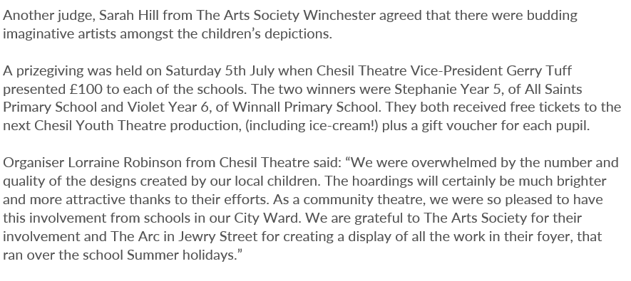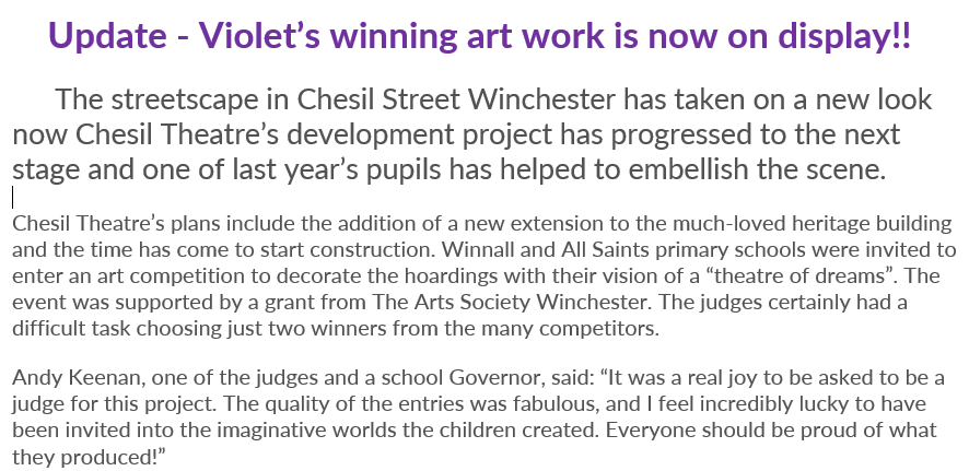 We were very pleased to take part in the art competition organised by the Chesil theatre to design an image for their hoardings whilst they had building work taking place. We were delighted to hear that Violet had won and her art work is being displayed - please do take a look as you walk or drive past.